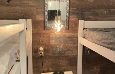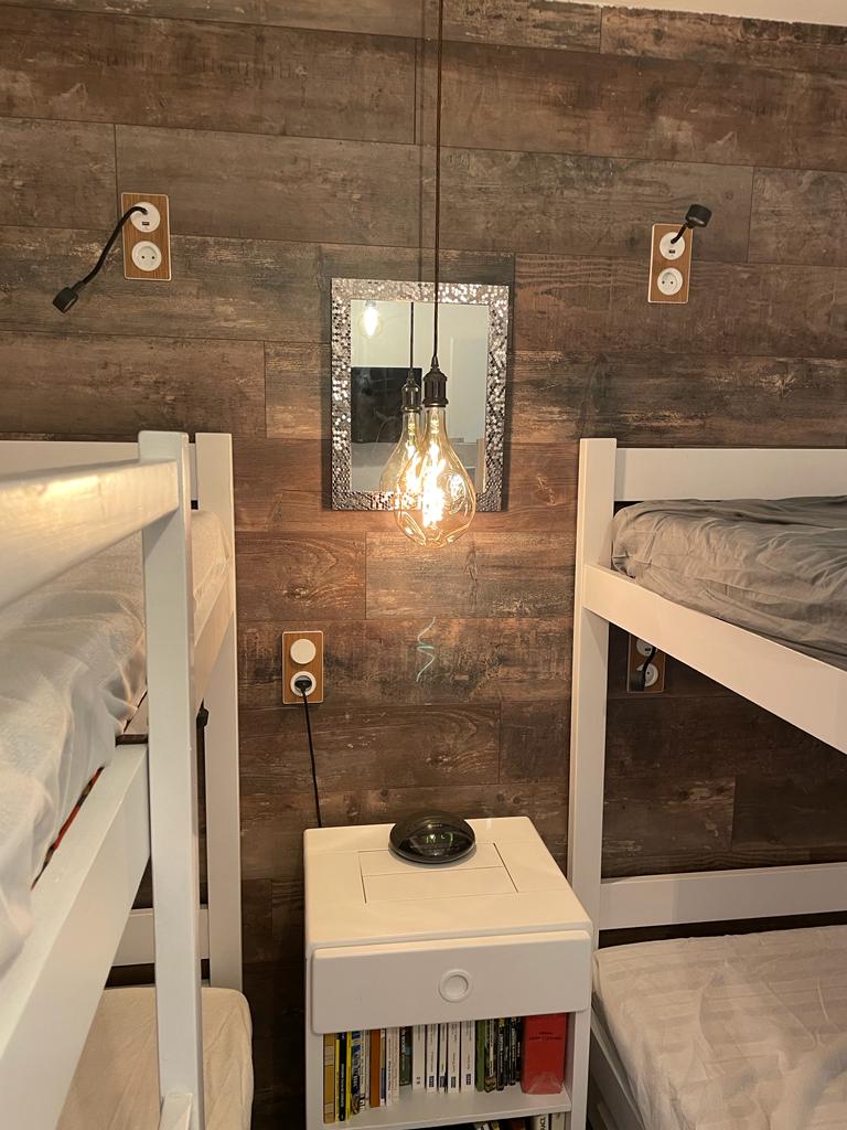 Une chambre équipée de 2 lits superposés (4 couchages), avec une lampe de lecture et une prise électrique à chaque lit. Télévision.